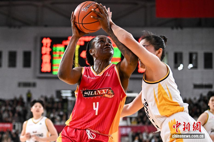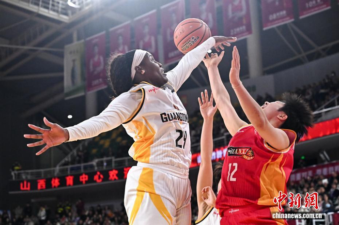 12月25日,东莞队球员科利尔在比赛中封盖山西队球员上篮。当日,在太原举行的2025-2026赛季中国女子篮球联赛常规赛第9轮比赛中,山西竹叶青队主场以69比72不敌东莞新彤盛队。中新社记者 韦亮 摄