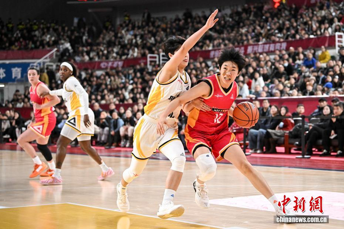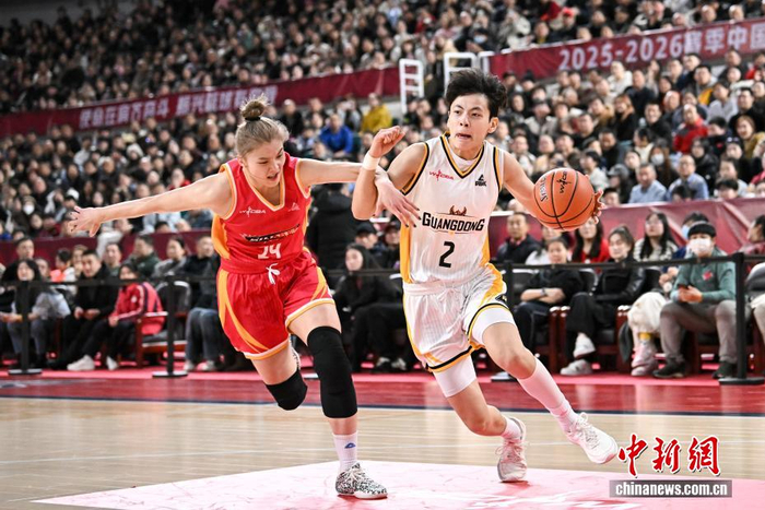 12月25日,东莞队球员杨舒予在比赛中带球突破。当日,在太原举行的2025-2026赛季中国女子篮球联赛常规赛第9轮比赛中,山西竹叶青队主场以69比72不敌东莞新彤盛队。中新社记者 韦亮 摄