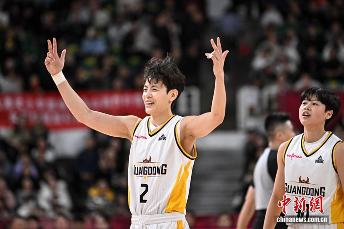 12月25日,东莞队2号球员杨舒予在比赛中庆祝进球。当日,在太原举行的2025-2026赛季中国女子篮球联赛常规赛第9轮比赛中,山西竹叶青队主场以69比72不敌东莞新彤盛队。中新社记者 韦亮 摄